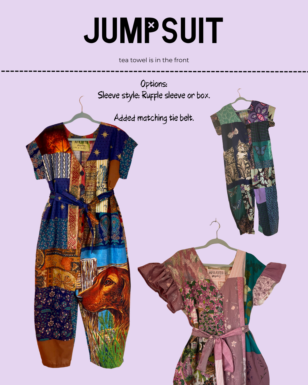 🌿 The Jumpsuit - This stand-out item is an oversized, comfortable garment featuring a v-neckline, slightly ballooned legs, pockets and a button front fastening. The tea towel will either be placed on one side of the jumpsuit, or cut in half and placed at the front/back - this depends on the tea towel design.