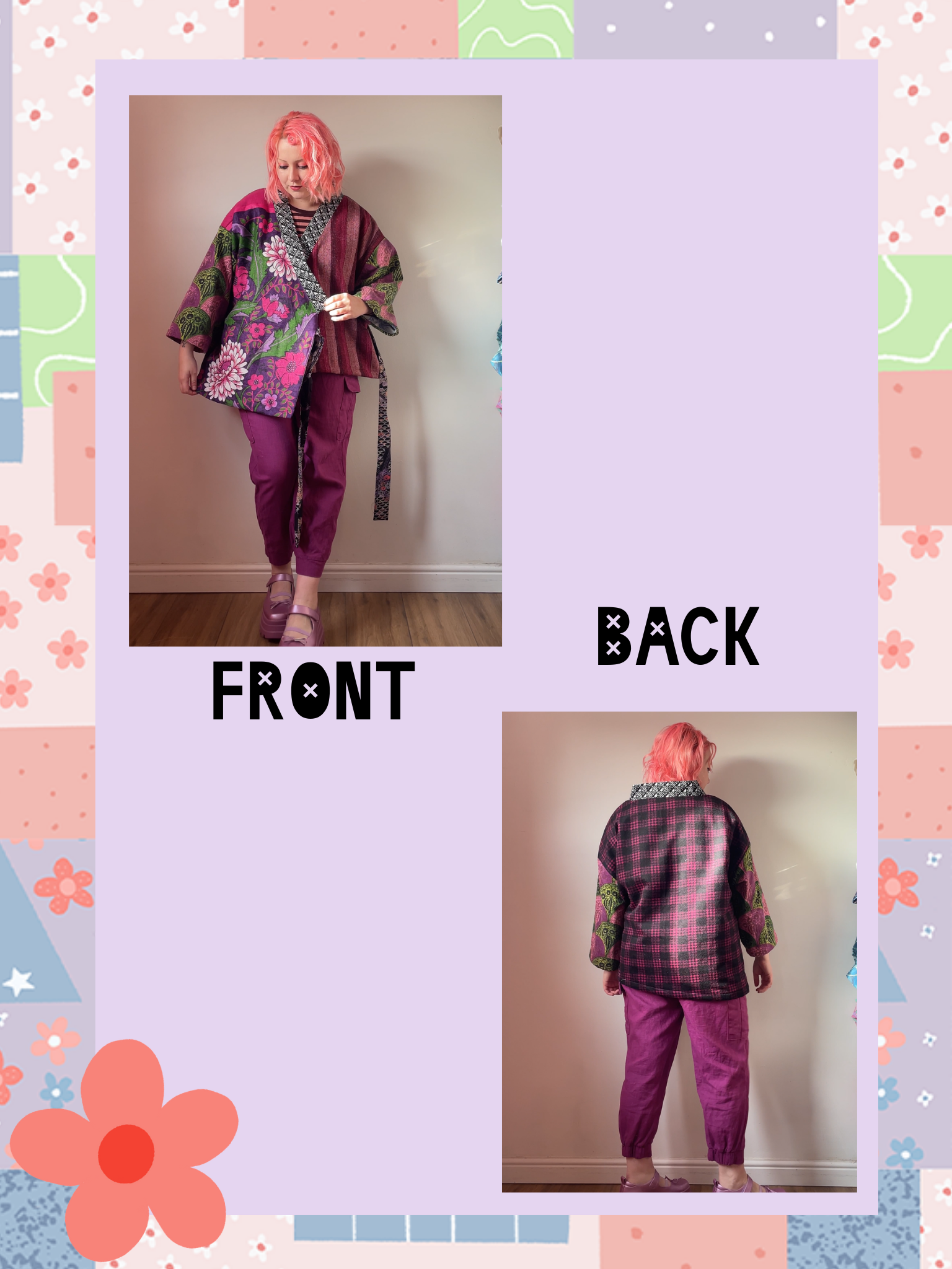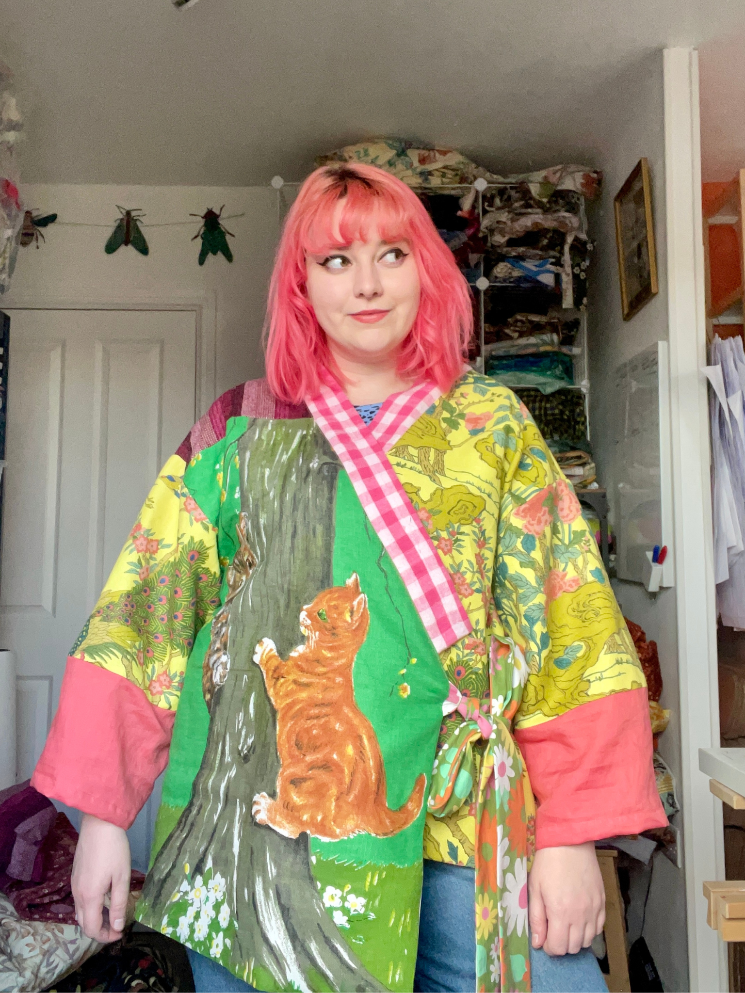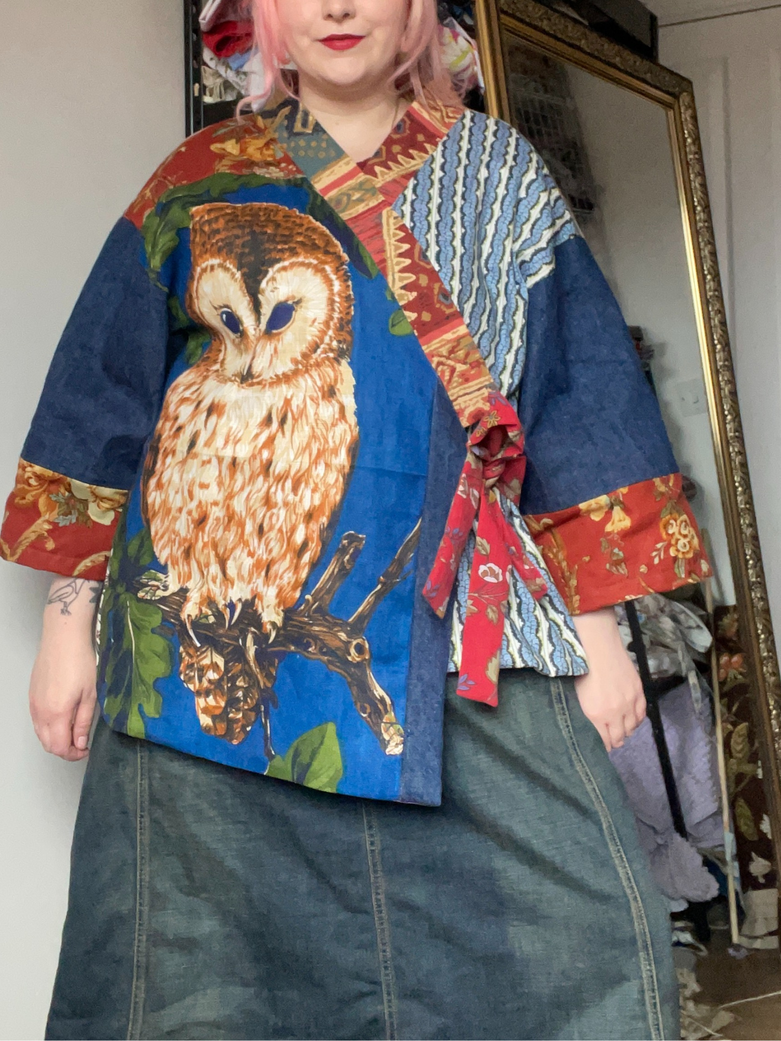 This jacket is the perfect opportunity to use some fabric scraps and play with different colours and patterns that either suit or clash with your chosen tea towel. This is a particularly special pattern. It has been created from scratch with a tea towel being the main focus - it's an asymmetric jacket for this reason!