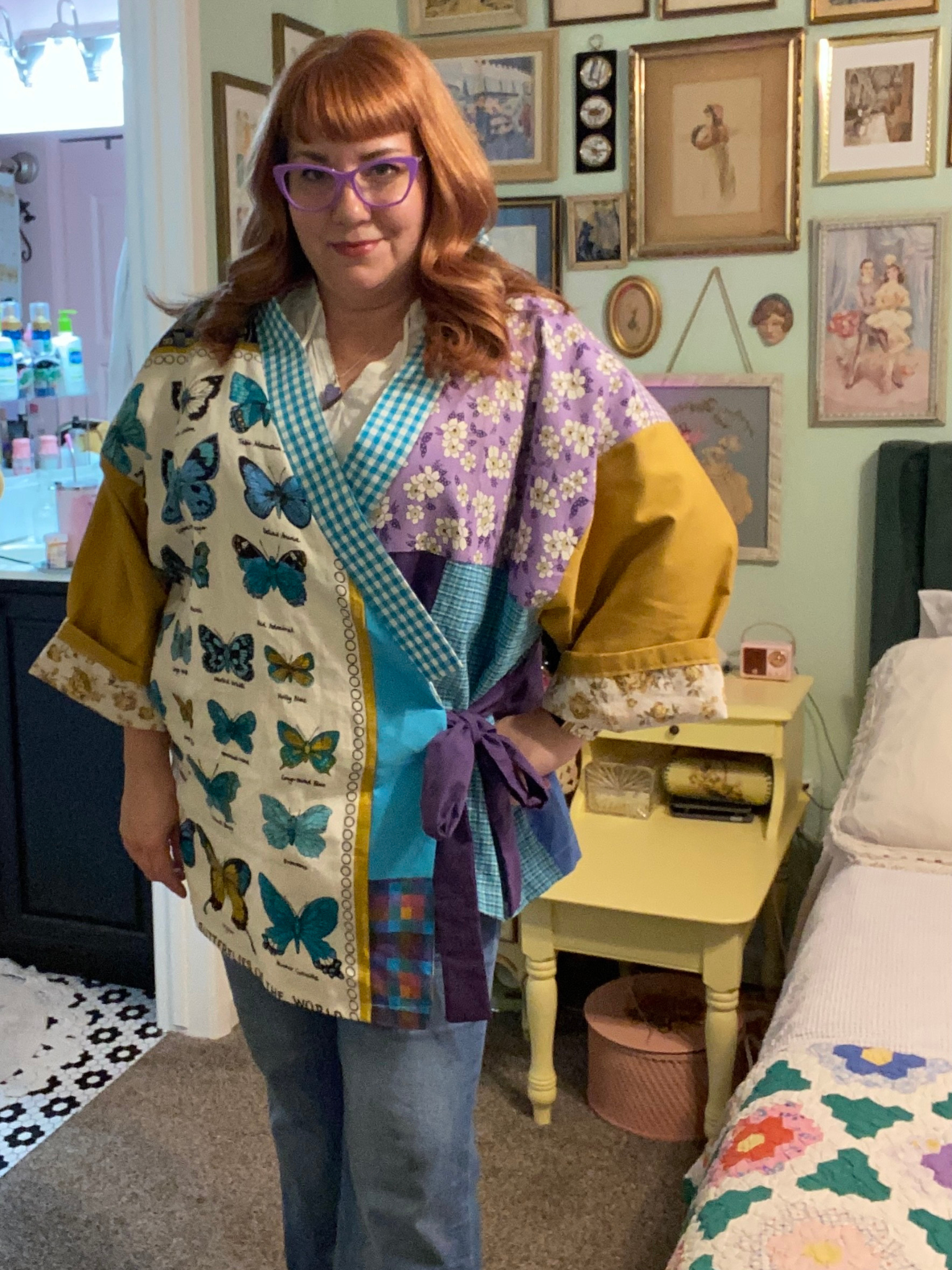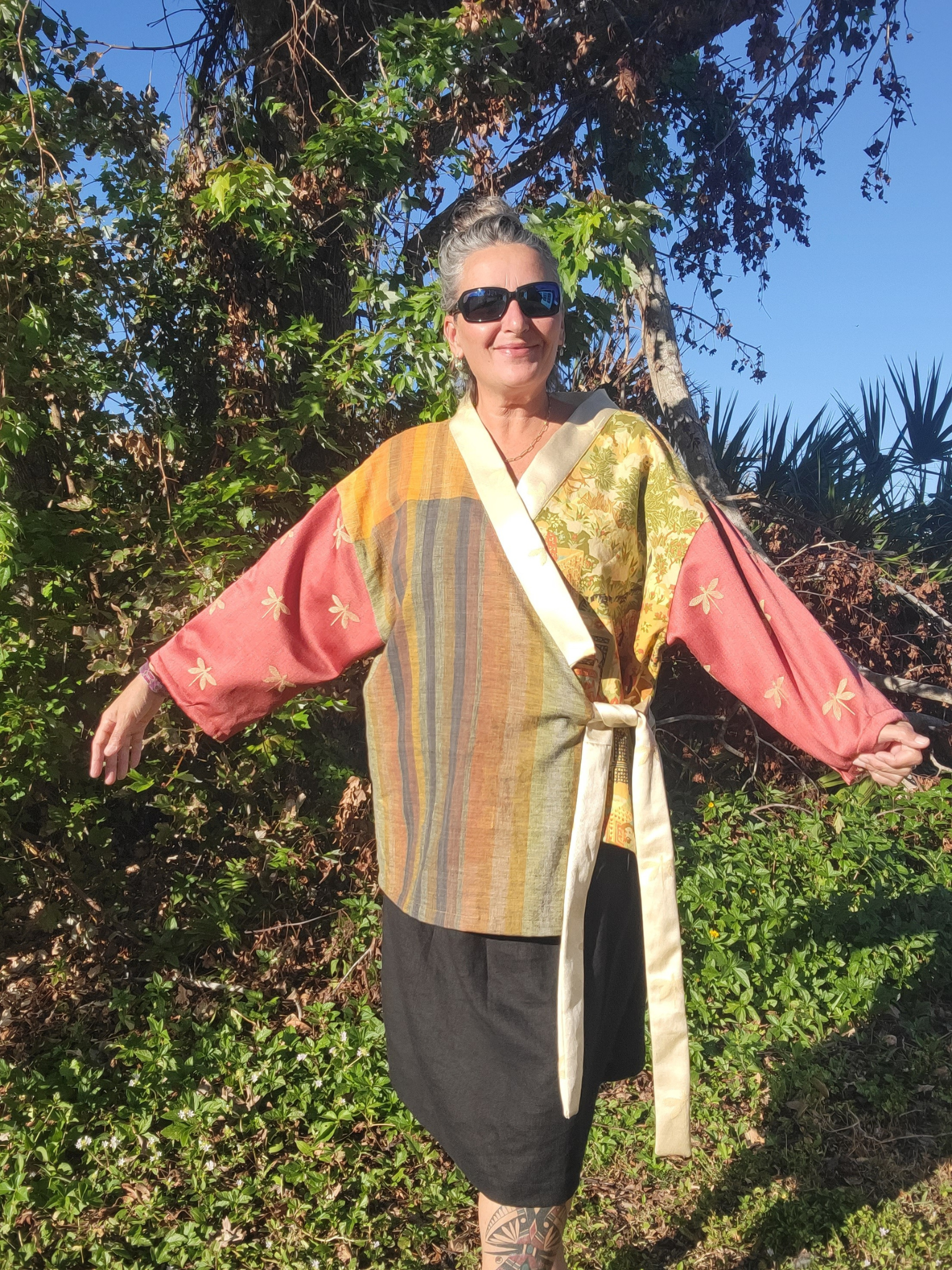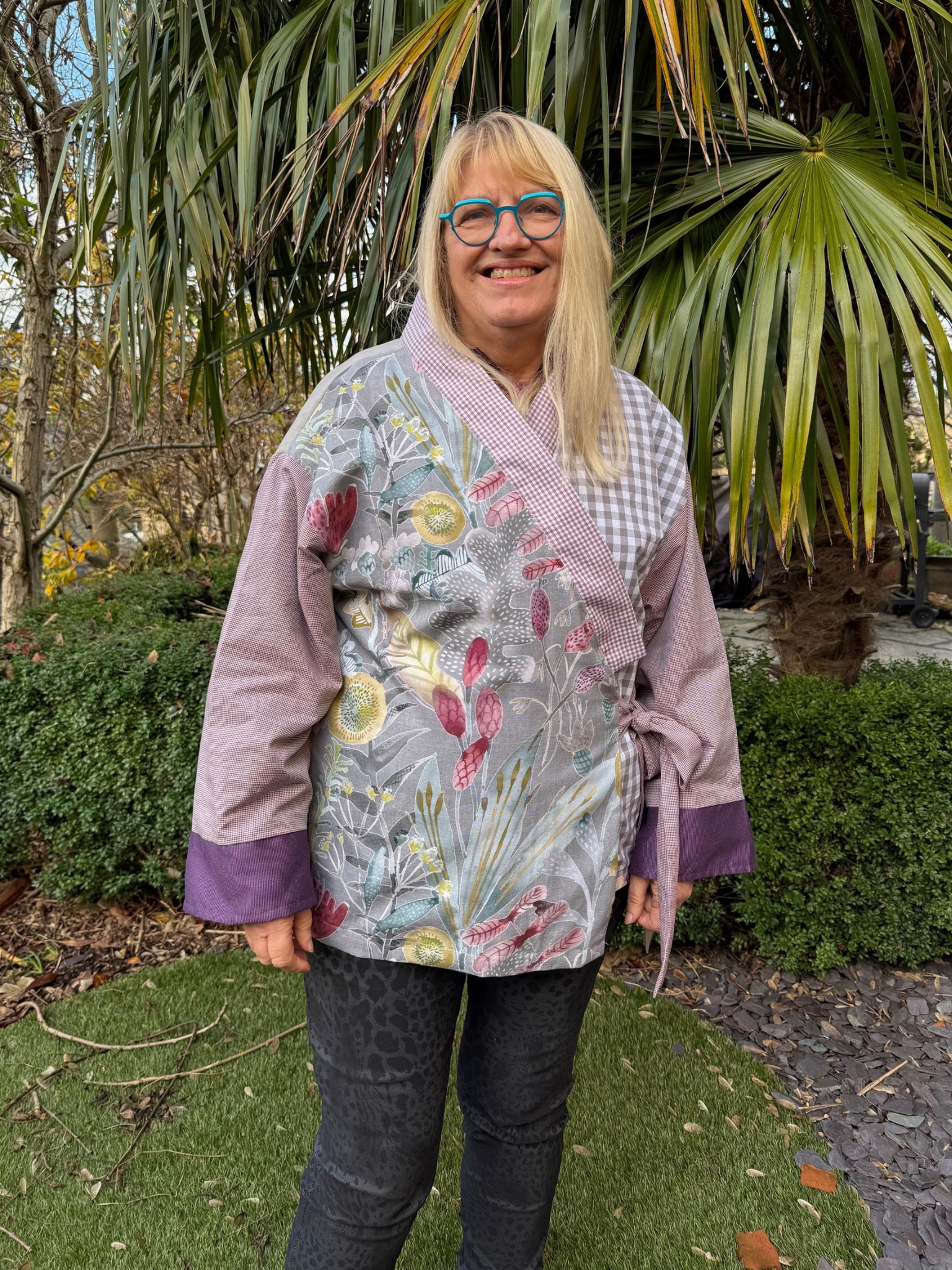 This jacket is the perfect opportunity to use some fabric scraps and play with different colours and patterns that either suit or clash with your chosen tea towel. This is a particularly special pattern. It has been created from scratch with a tea towel being the main focus - it's an asymmetric jacket for this reason!