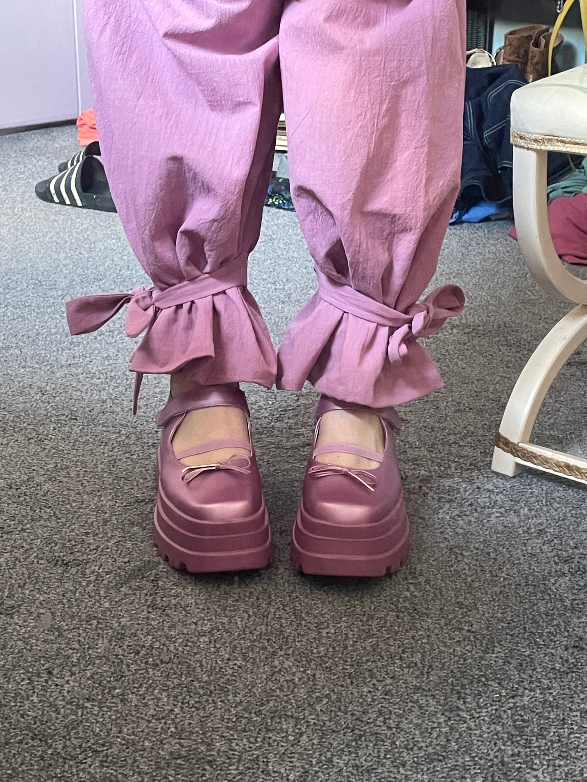 The trousers have an elasticated waist, pockets and balloon shaped legs.
